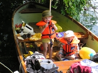 2005-08-23 Peter, Jana, Jesse und Jorina fahren mit dem Ruderboot zum Brombeeri-Essen.