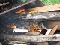 | Wir machen Feuer im alten Ofen vom Campervan. | |